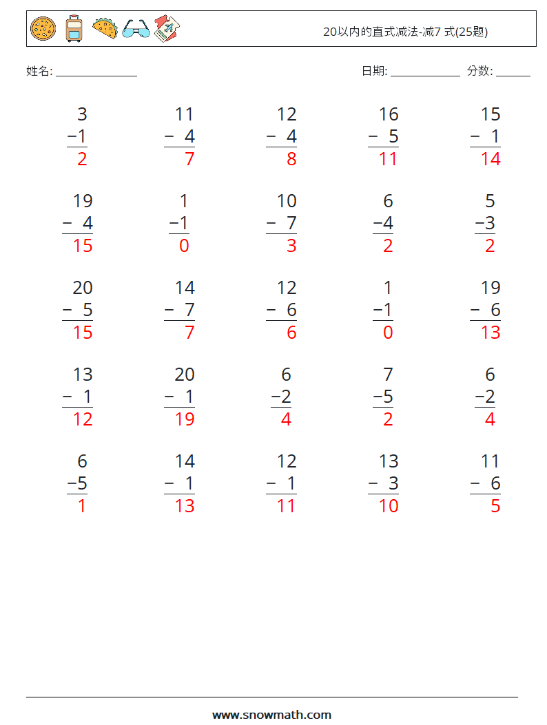 20以内的直式减法-减7 式(25题)