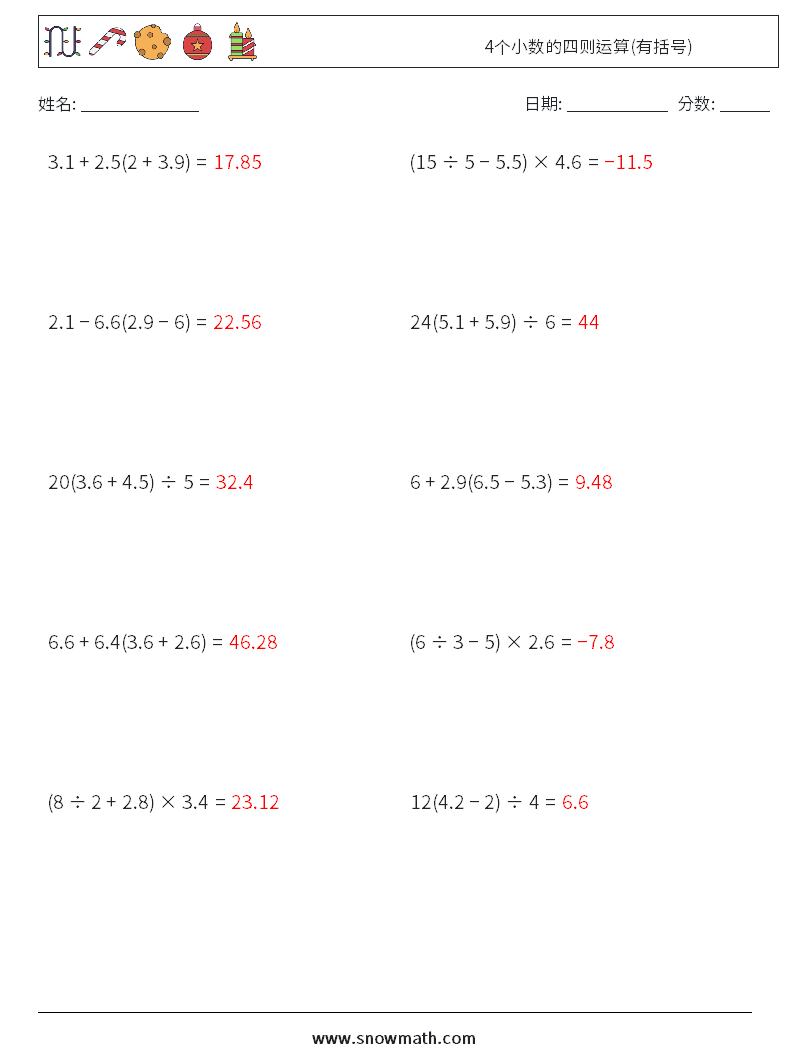 4个小数的四则运算(有括号)