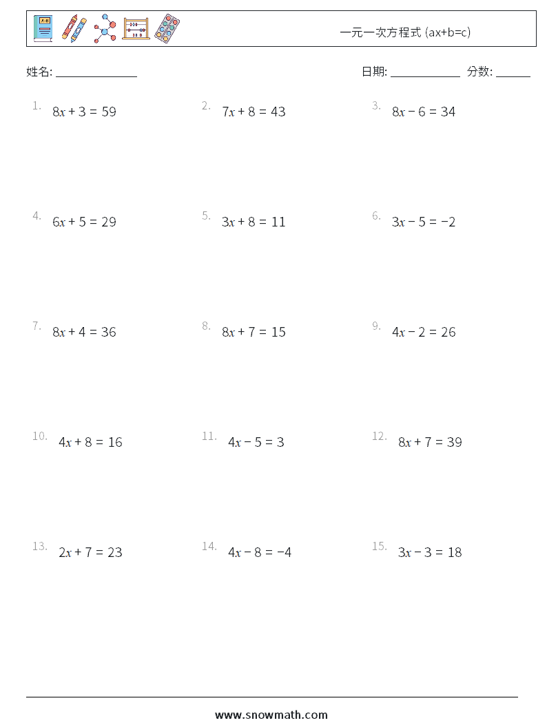 一元一次方程式 (ax+b=c) 数学练习题 15