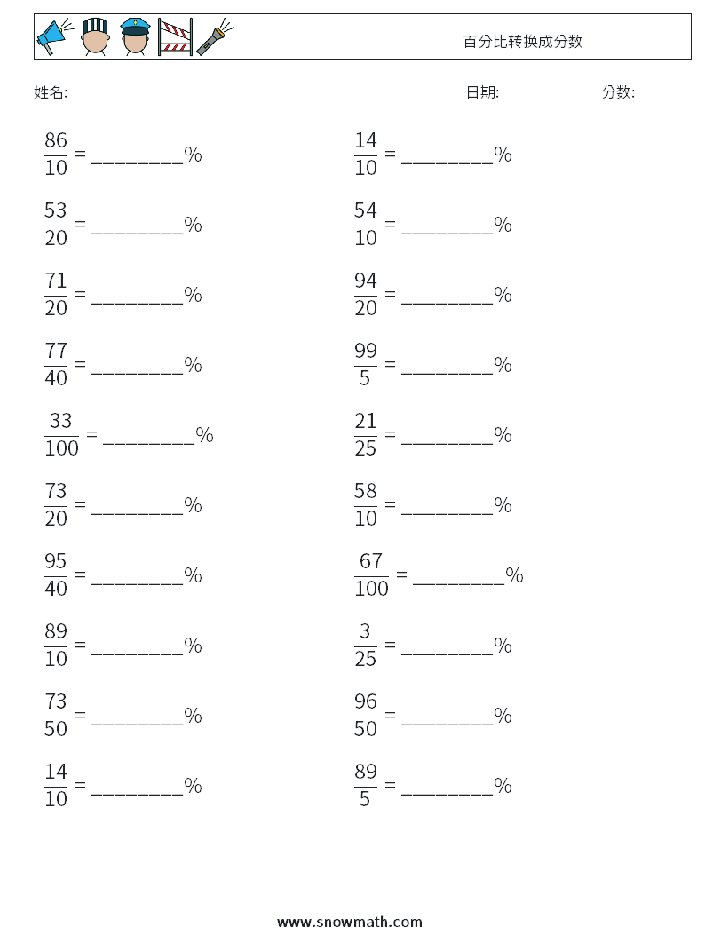 百分比转换成分数 数学练习题 3