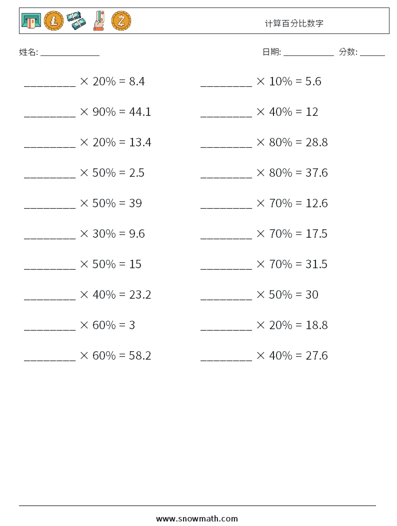 计算百分比数字 数学练习题 3