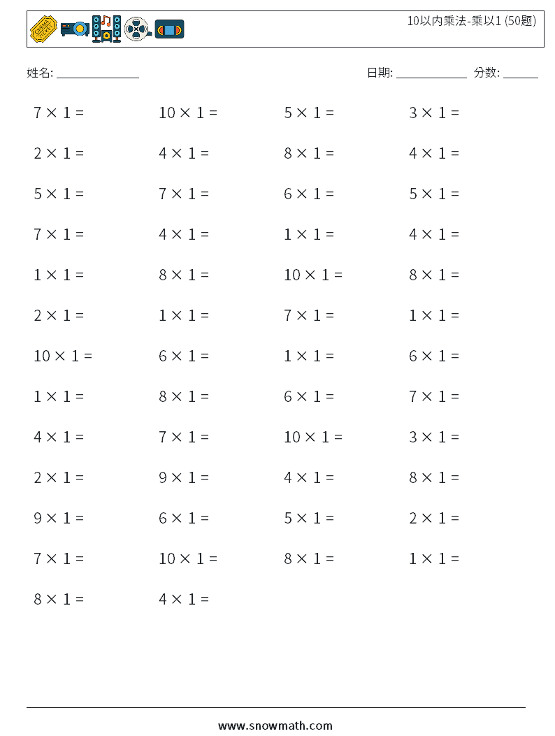 10以内乘法练习题-乘以1 (50题)