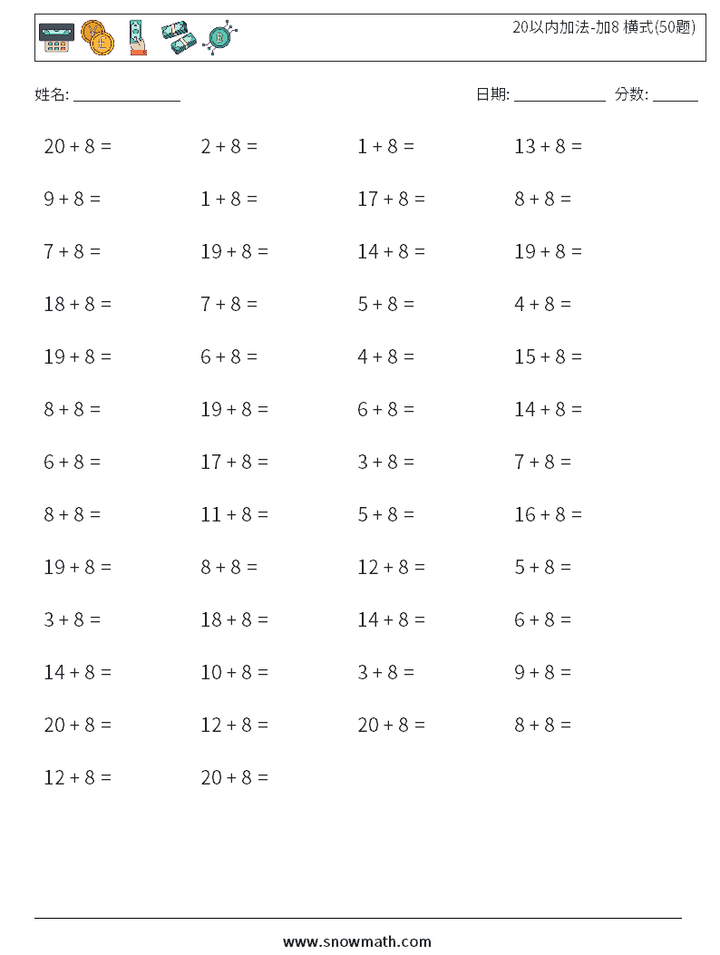 20以内加法-加8 横式(50题) 数学练习题 4