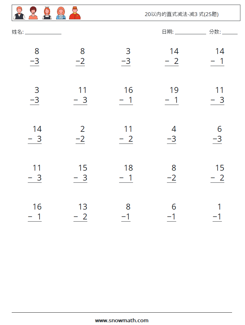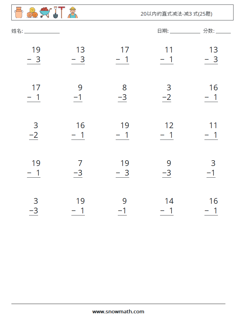 20以内的直式减法-减3 式(25题) 数学练习题 3