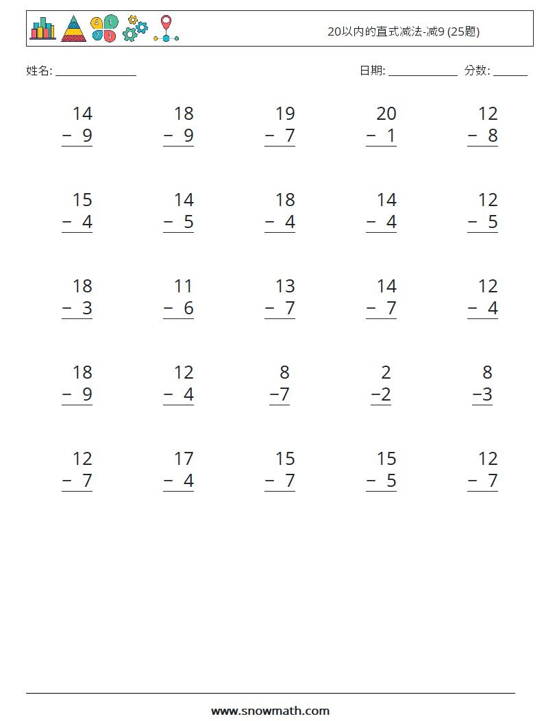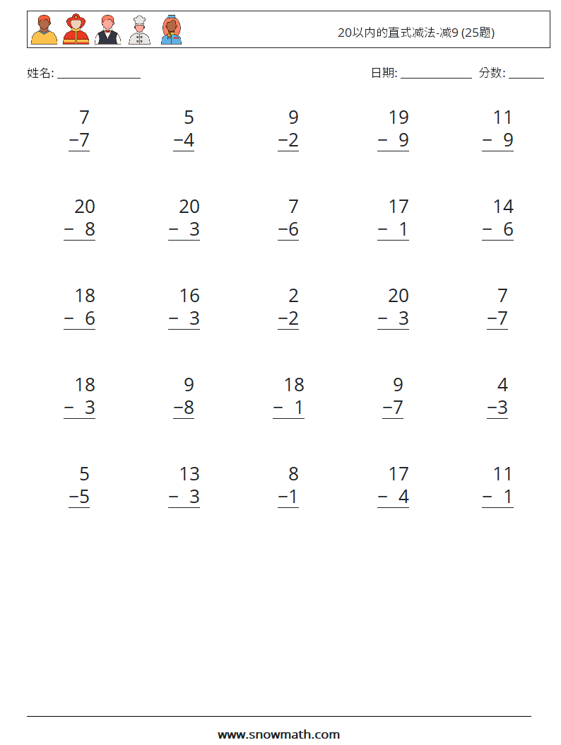 20以内的直式减法-减9 (25题)