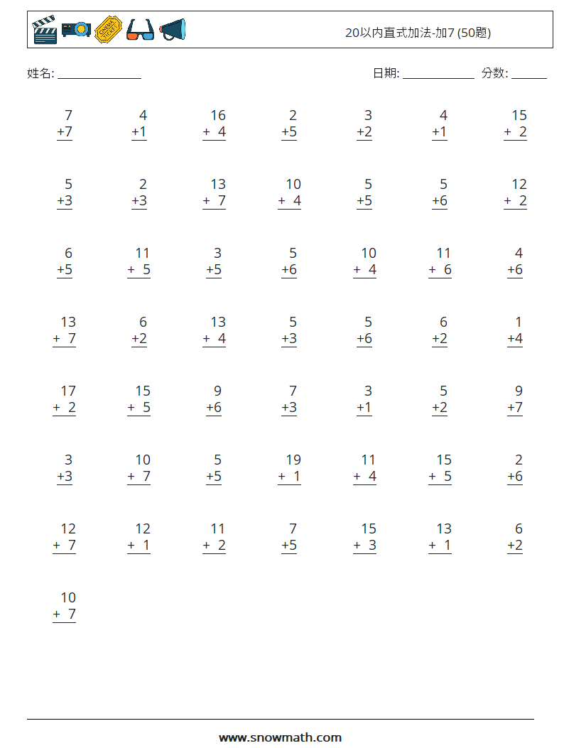 20以内直式加法-加7 (50题)