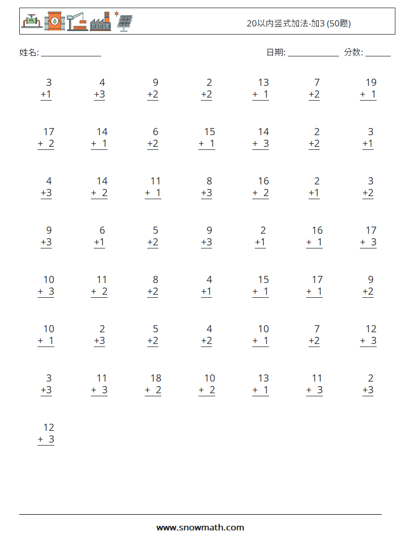 20以内竖式加法-加3 (50题) 数学练习题 6
