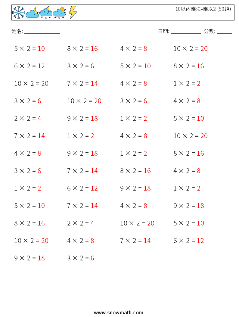 10以內乘法-乘以2 (50題) 數學練習題 7 問題,解答