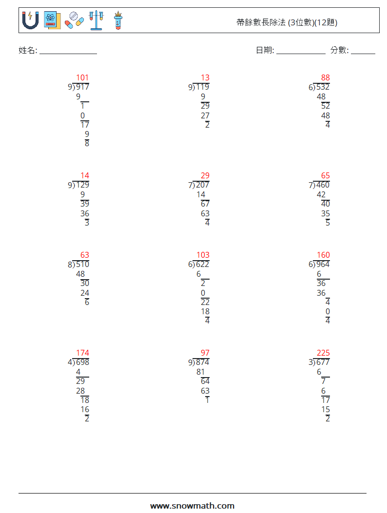 帶餘數長除法 (3位數)(12題)