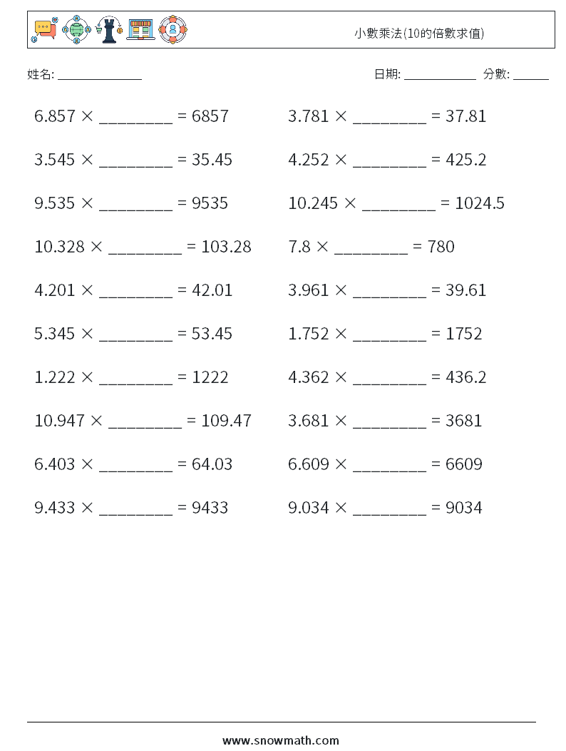 小數乘法(10的倍數求值) 數學練習題 3