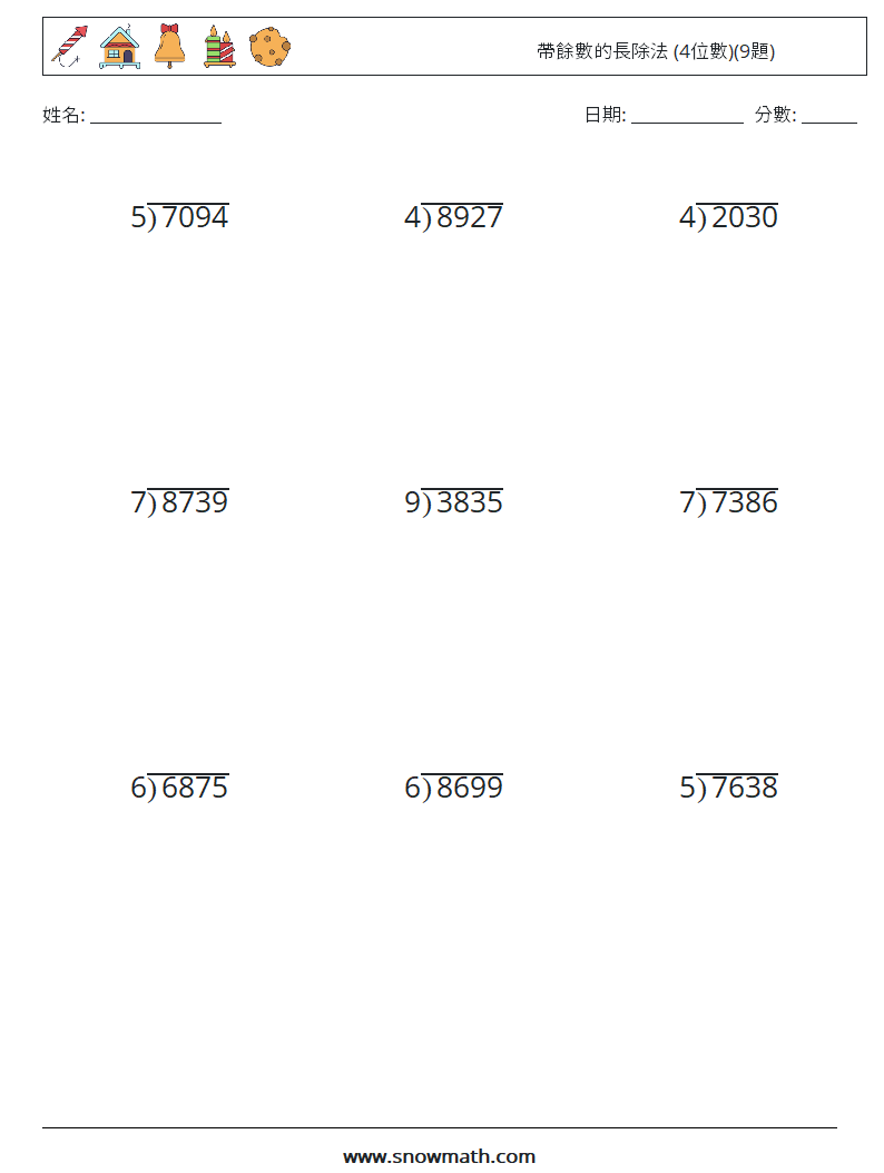 帶餘數的長除法練習題 (4位數)(9題)