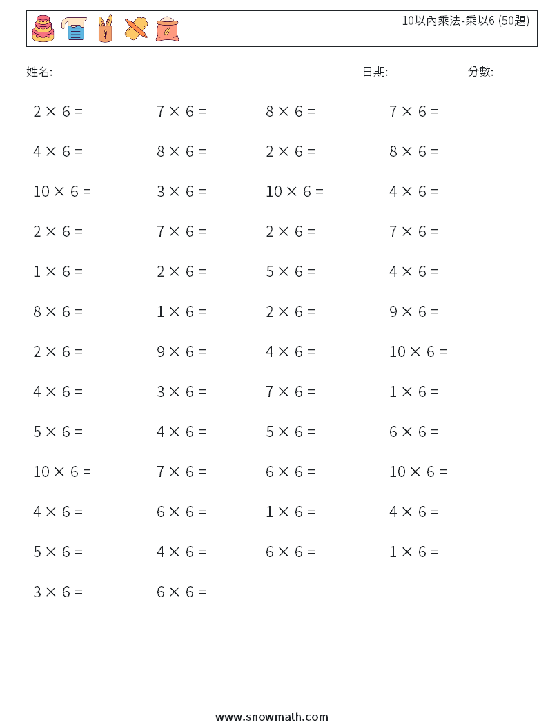 10以內乘法-乘以6 (50題) 數學練習題 1