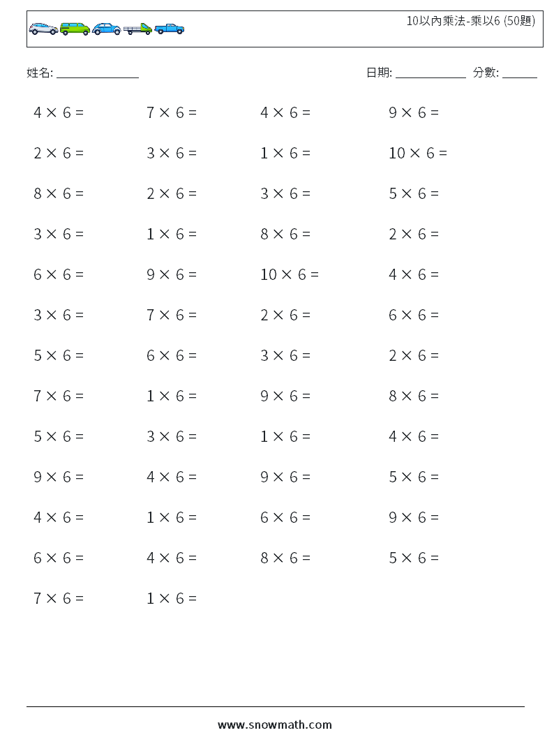 10以內乘法-乘以6 (50題) 數學練習題 3
