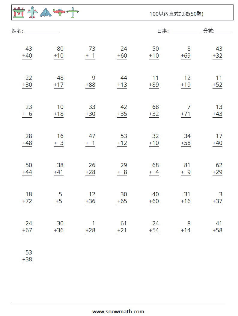 數數, 寫數字 寫數字 數數字 加法 5以內加法 10以內加法 20以內加法 加法-100以內 1000以內加法 2位數加法 3位數加法 4位數加法 5位數加法 減法 10以內减法 20以內减法 2位數减法 3位數减法 乘法 9x9 乘法 20x20 乘法 2位數乘法 3位數乘法 除法 除法 (2位數) 除法 (3位數) 四則運算規則 整數四則運算 分數四則運算 小數四則運算 因數分解, 公因數, 公倍數 最大公因數 最小公倍數 因數計算 分數 分數基礎 分數加法 分數減法 分數乘法 分數除法 小數 小數加法 小數减法 小數乘法 小數點除法 小數乘法(10倍數) 指數 指數基礎 指數(代數基礎) 指數加減乘除四則運算 百分比 百分比與分數轉換 百分比與小數轉換 數字的百分比 代數方程式 不等式 一元一次方程式 二元一次方程式 多項式方程式 多項式因式分解 求解多項式方程 冪和指數