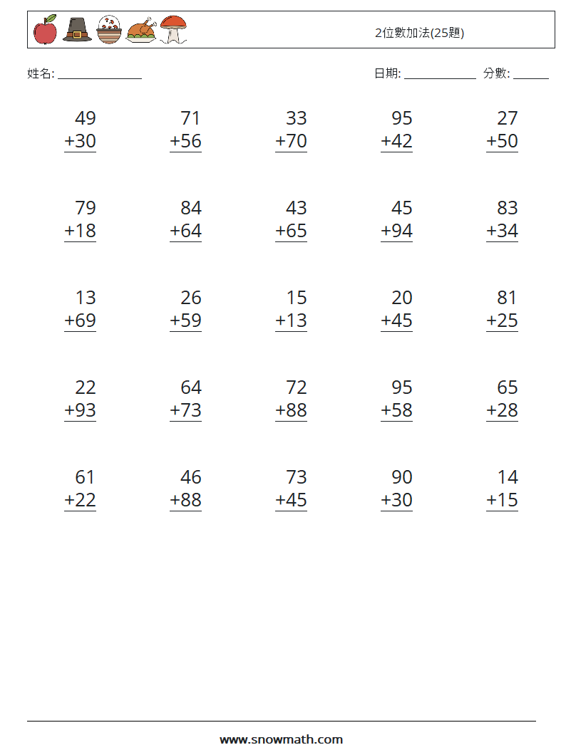 加法練習題 (2位數)(練習題25題) 進位或借位
